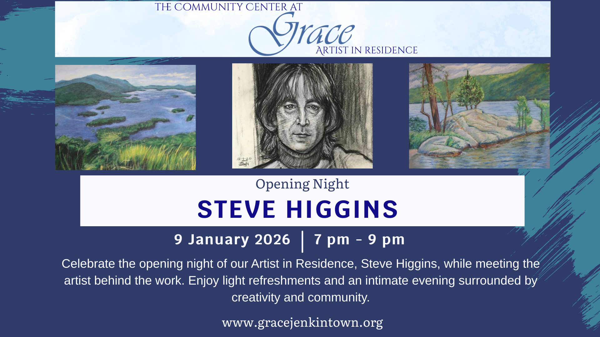 Celebrate the opening night of our Artist in Residence, Steve Higgins, while meeting the artist behind the work. Enjoy light refreshments and an intimate evening surrounded by creativity and community.