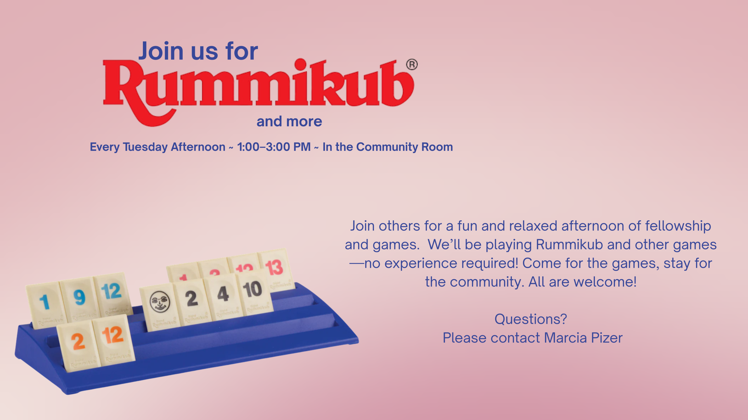 Join others for a fun and relaxed afternoon of fellowship and games. We’ll be playing Rummikub and other games—no experience required! Come for the games, stay for the community. All are welcome!